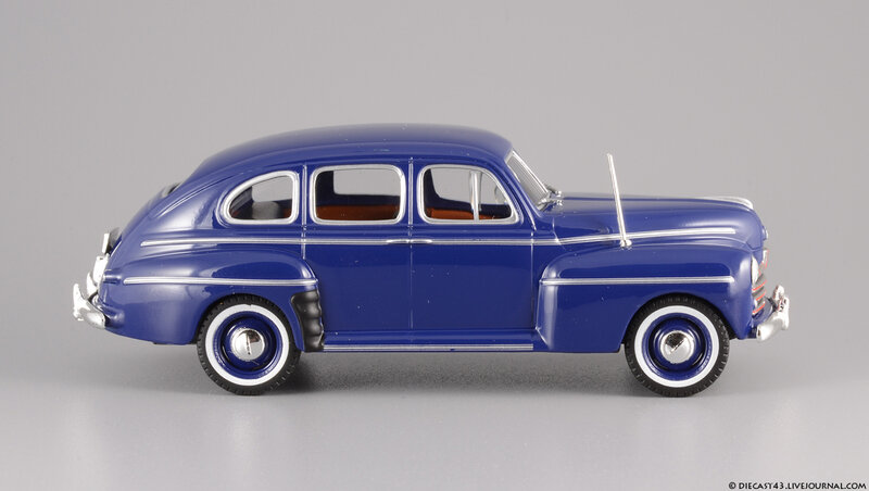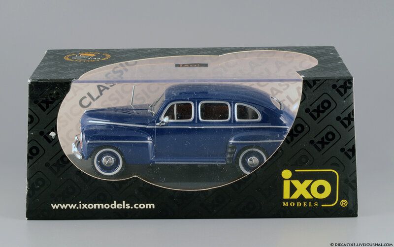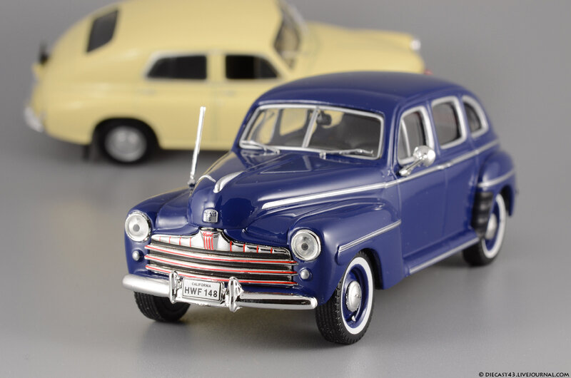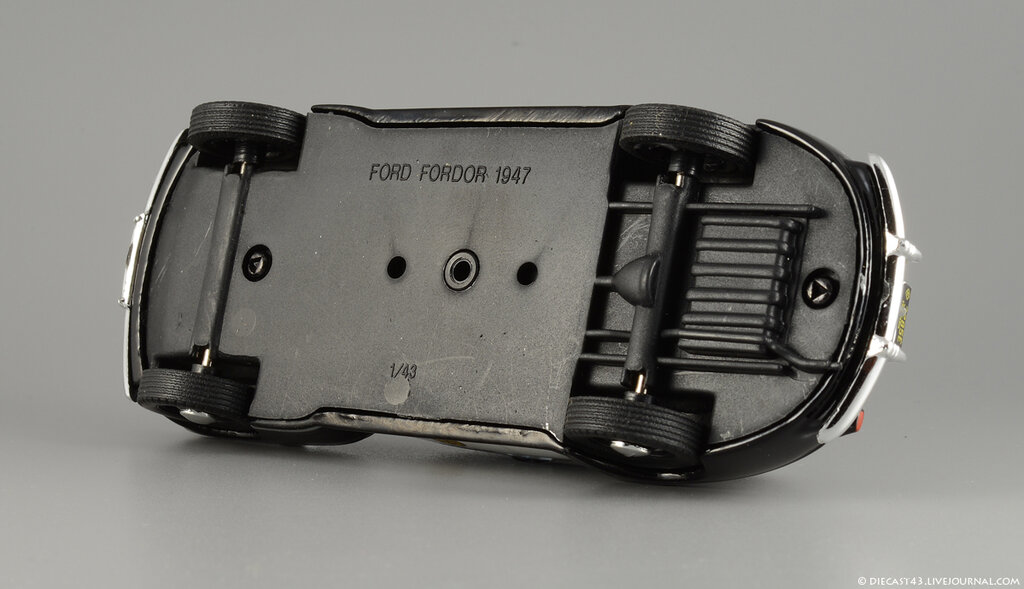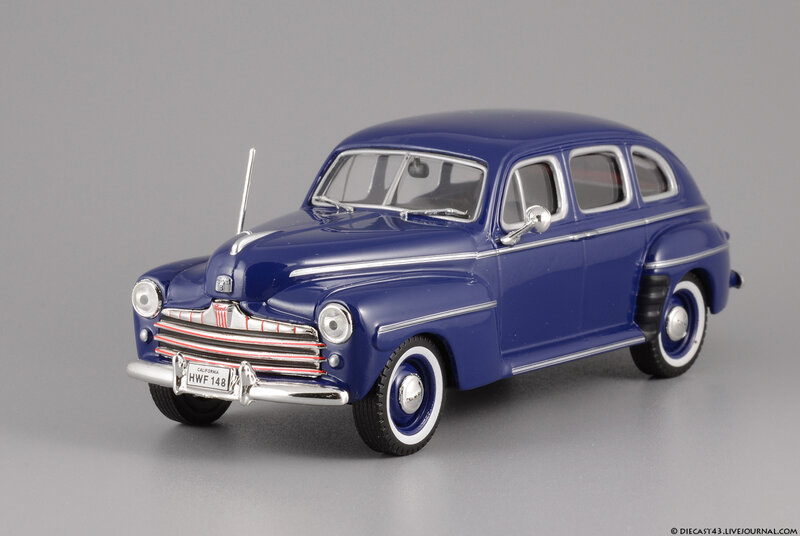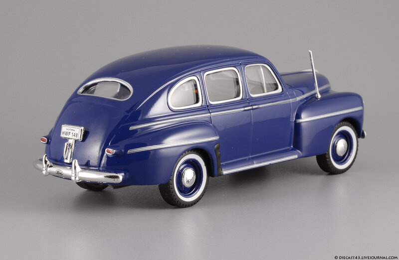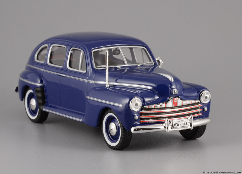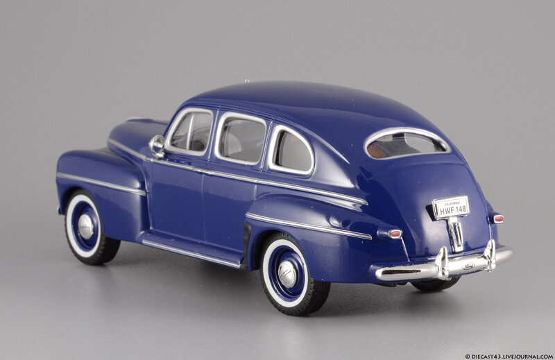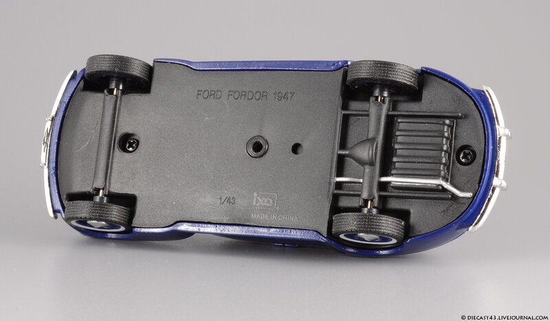 Модель на фотографиях - "ранний IXO", из тех времён, когда не было ещё засилья журнальных серий и за кошелёк коллекционера боролись известнейшие гранды, каждый из которых переживал не лучшие времена. Китайцы тщательно и с умом выбирали объект для будущей масштабной копии, и многие из тех моделей, несмотря на недостатки, сейчас в цене - ведь альтернативы за десятилетие не появилось. Среди таких моделей и этот синий Ford Fordor 1947. Впрочем, китайские товарищи с самого начала своей работы заложили традиции выпуска неведомых мутантов - позднее мы все увидим результаты их селекции в виде регулярных моделей под маркой IST Models, а особо увлечённые собиратели займутся поиском реальных прототипов под китайские фантазии в масштабе 1:43. На примере этого Форда можно наблюдать занимательный симбиоз моделей 1946 года (именно у них красной краской заливали углубления в брусьях решётки) и 1947 (этому варианту соответствует светотехника и остальные детали). Ну и традиционное плоское дно вкупе с широченной резиной - неотъемлемые части образа китайской масштабной копии.