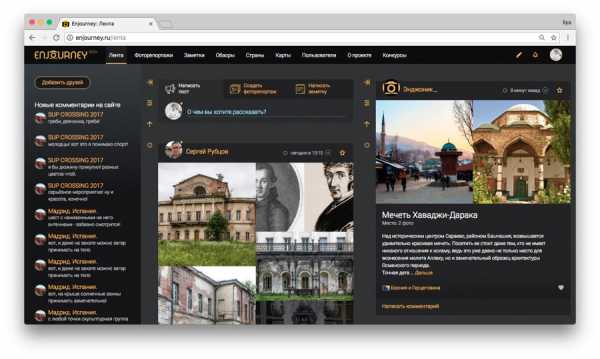 Алексей Звягинцев, основатель Enjourney.ru Я, как и многие люди, очень люблю путешествовать. Каждый раз, возвращаясь из очередного путешествия, я привозил массу эмоций, которые хотел разделить с другими людьми, поделиться своими впечатлениями, показать фотографии. Для этих целей изначально использовал форумы, затем завел свой блог, использовал другие платформы. И, к своему удивлению, не нашел ту, которая бы на 100% отвечала моим потребностям. Поэтому решил создать проект, который будет отвечать нужным требованиям. То, что сейчас есть на сайте — это, наверное, 15-20% от всего задуманного. Воплощение остальных решений — вопрос времени. Есть другие проекты — создание концепций для них может занимать годы. У нас есть несколько таких проектов. Мы периодически возвращаемся к ним, для них куплены домены. Но мы понимаем, что еще немного не то, надо еще на какое-то время отложить проект, чтобы он «дозрел». Одну такую концепцию мы крутим уже года полтора точно, и только недавно увидели в ней новые смыслы и очертания. Еще года через полтора, вероятно, она увидит свет. | |
