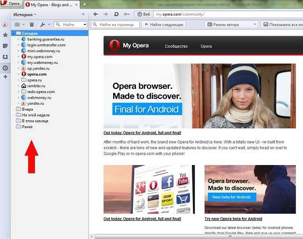 В браузере Opera список посещенных страниц называется, как и в Chrome, «История», и найти его можно либо в главном меню, либо на боковой панели инструментов по аналогии с Internet Explorer.