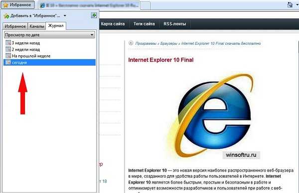 В последних версиях Internet Explorer журнал находится во вкладке «Избранное» на панели инструментов и так и называется «Журнал», нажав на него, вы увидите список периодов, из которых сможете выбрать нужный вам, чтобы «заглянуть в прошлое».