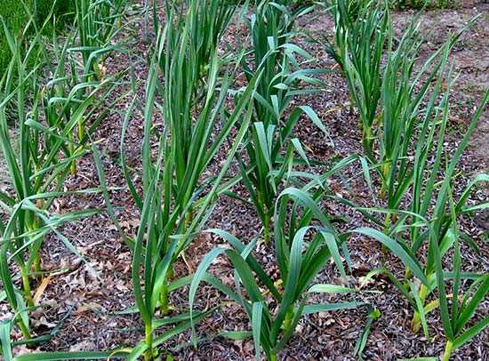 Не нужно укрывать грядки толстым слоем листьев или соломы, под который устремляются на перезимовку вредители со всего огорода. Требуется лишь минимальное укрытие (слой до 5 см). Во время подкормок удобрения не сразу попадают на корни, а поступают к ним постепенно. Летом, в период засухи, не требуются частые поливы, так как корни на глубине 7–9 см чувствуют себя комфортно. На такой глубине зубки оказываются в результате незначительного подъема корнями, поверхностного размывания почвы дождями и ее уплотнения.