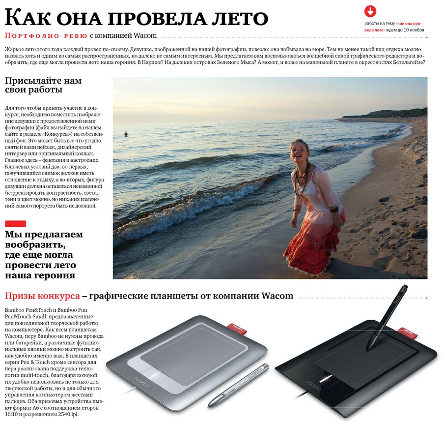 Вот такой совместный с компанией Wacom конкурс мы объявили в октябрьском номере Digital Photo, сигнальный экземпляр которого только сегодня достиг порога нашей редакции. Однако читатели этого блога (есть тут кто?) уже могут испытать свою удачу. Условия конкурса - ниже, девушка - тут, а адрес следующий - [email protected].