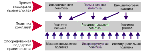 Взаимосвязь макро- и микроаспектов экономических достижений давно известна. Одну из самых популярных прикладных моделей экономического развития предложил в книге "Международная конкурентоспособность стран" профессор Гарвардской школы бизнеса Майкл Портер (схема 1). Ромб экономического развития описывает взаимосвязь стратегии фирм, их структуры и конкуренции; параметров спроса; смежных отраслей; качества бизнес-среды. Влияние же правительства, согласно Портеру, проявляется через качество бизнес-среды и государственные закупки. Филип Котлер, которого в России хорошо знают как автора учебника по корпоративному маркетингу, в другой своей менее известной книге "Маркетинг стран" подчеркивает, что рост благосостояния страны является результатом партнерских отношений между корпорациями и правительством, проявляющихся через инвестиционную, промышленную, внешнеторговую, макроэкономическую, инфраструктурную и институциональную политику (схема 2). Рейтинг конкурентоспособности стран Всемирного экономического форума в Давосе принимает в расчет наряду с политическим, законодательным, макроэкономическим контекстом также и качество корпоративного управления компаниями, базирующимися в той или иной стране (схема 3).