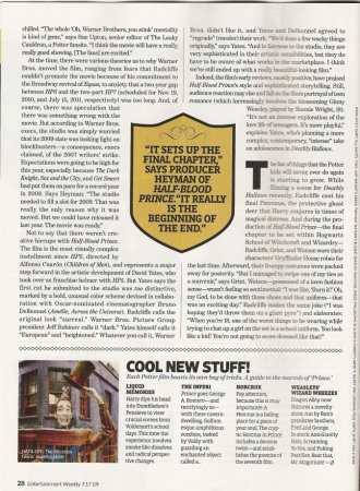 Мы поговорили о «Гарри Поттере и принце-полукровке», экранизации шестой книги из серии Дж. Роулинг, которая будет показана в кинотеатрах с 15 июля. В прошлом августе Warner Bros. решили перенести премьеру с первоначально запланированной на 21 ноября на это лето, вызвав недовольство фанатов Поттера по всему миру. Сегодня поттероманы так увлечены рассказами о съемках двухсерийного фильма «Гарри Поттер и дары смерти», что снова вызвать интерес к «Принцу-полукровке», по словам режиссера Дэвида Йейтса, «Немного проблематично.» Для Рэдклиффа этот «альбом с воспоминаниями» очень ярок: «Я помню работу с Джимом Бродбентом. Это невероятно весело».