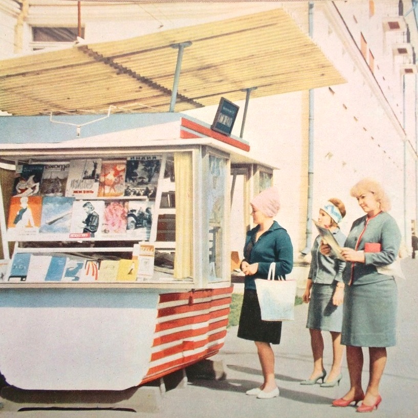 Газеты: Газеты, в основном, все выписывали, а в киосках покупались иностранные журналы, специализированные и пр. "Кругозор", "Колобок", "Горизонты Техники для Детей", FRÖSI можно было купить только в киоске, поэтому приходилось бегать в поиске их купить. Киоски были стандартными, вот такими, как на снимке. Фото из издания "Новгород" (1967). На витинах выложены журналы (верхний ряд, справа на лево): "Индия", "Музыкальная Жизнь", "Охота и охотничье хозяйство", "Огонёк". В центре журнал "Искусство". Остальные, увы, распознать не удалось. Весь альбом можно посмотреть здесь:"Новгород" (1967)