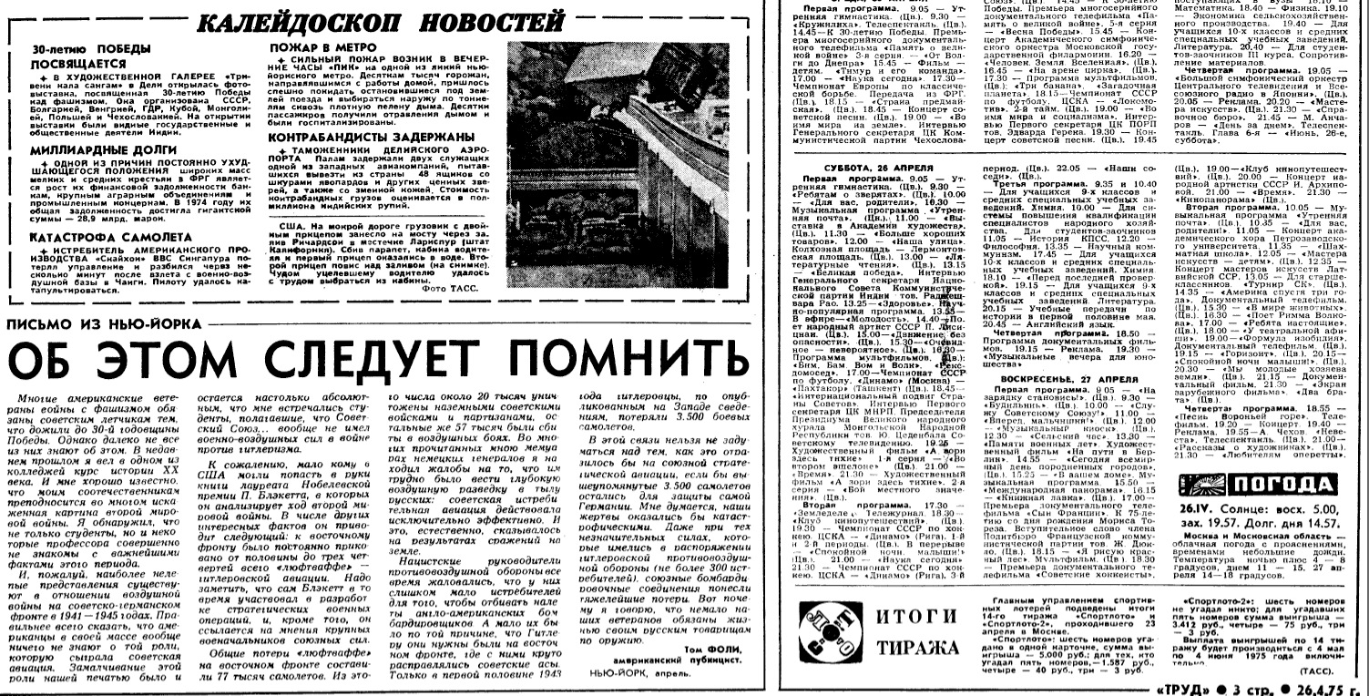 Начиная с третьей начиналось что-нибудь интересненькое. Номер от 26 апреля 1975. 1975 - год 30-летия Победы в Великой Отечественной, поэтому много материалов на эту тему. Программу телепередач печатали на каждый день, а в конце недели - на всю неделю.