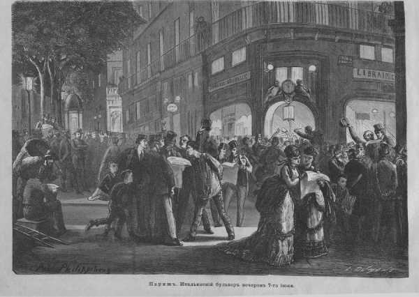 Парижане на следующий день после парламентских выборов 6 июня 1869 года с интересом узнают из газет имена победивших политиков.