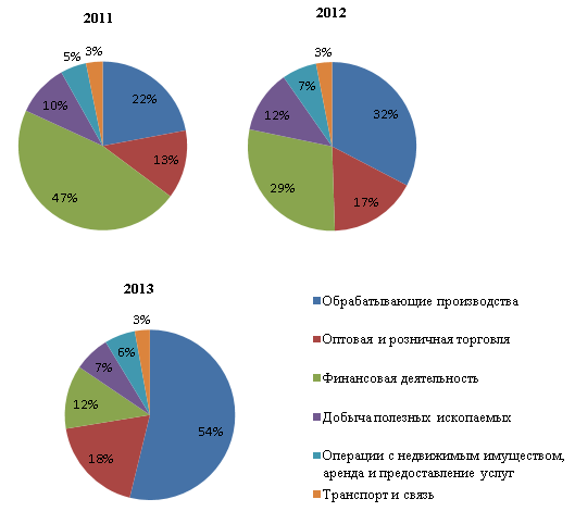 Проанализируем отраслевую структуру, поступивших иностранных инвестиции в экономику Россию. Как видно из таблицы 1, за период 2011–2013 гг. произошли значительные изменения: