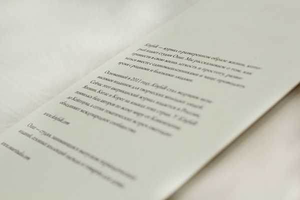 Каждый номер посвящен какой-то неочевидной теме – почему не стоит бояться старости, чем бы заняться весной, зимой, летом и осенью, куда бы поехать в путешествие, что бы такого вкусного съесть и понюхать. Люди спокойно, как за дачным столом, рассказывают о себе и своем деле, о том, как они живут и как им клево. Эффект от пролистывания журнала максимально приближен к эстетическому приходу от просматривания каких-нибудь картинок про рукоделие в Pinterest и снимает стресс лучше, чем часовое почесывание кота. Немедленно хочется бросить все к чертям, уехать в деревянный деревенский дом и там, надев красивые резиновые сапоги, посвятить себя выращиванию герани.