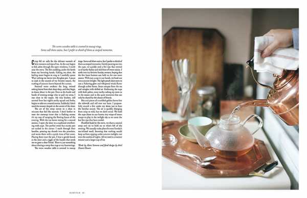 Да-да, Kinfolk для меня – не просто журнал. Это целая философия, которая мне очень близка. Отсутствие суеты, умение наслаждаться моментом, гармония с собой и окружающим миром, умение слушать тишину и замечать красоту простых вещей, важность семейных отношений и гастрономических традиций, ценность ручного труда – всё это органично переплетено под обложкой журнала. Герои номеров – не модели и не известные актёры. Это обычные люди. Парень из соседнего двора. Девушка, которую можно встретить в кофейне напротив. Ваш хороший друг.
