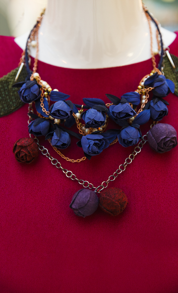 КОЛЬЕ ИЗ ШЕЛКОВЫХ ГОЛУБЫХ ЦВЕТОВ, КАРИНА БАГДАСАР ДЛЯ K’JEWELRY; КОЛЬЕ ИЗ ФЕТРОВЫХ ЦВЕТОВ НА СЕРЕБРЯНОЙ ВИНТАЖНОЙ ЦЕПОЧКЕ, НАТАЛЬЯ МАРЧЕНКО И ИВЛЯНА МАКИЕНКО ДЛЯ FLOWER ME (ОБА — СПЕЦИАЛЬНО ДЛЯ ПРОЕКТА)