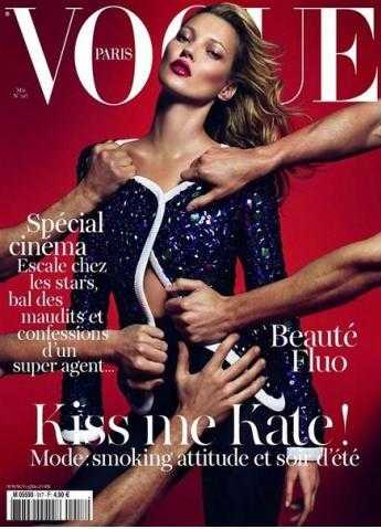 Глубокой идеей и закадровым подтекстом наделена обложка мартовского VOGUE с изображением известной топ-модели Кейт Мосс. Изюминка снимка в том, что одежду с нее пытаются сорвать мужские руки. Люди (чьи руки присутствуют кадре) сами не показываются зрителю с целью создания атмосферы загадочности. Кейт Мосс – главный герой фотографии. Она – объект вожделения, к которому стремится противоположный пол. Композиция снимка строится по закону золотого сечения: мужские руки соприкасаются с женским телом в точках, которые глаз зрителя считывает в первую очередь. С одной стороны, это перегружает снимок, делая его тяжелым и многофункциональным с точки зрения идеи. С другой стороны, акцент сделан на нескольких элементах одновременно, а именно на четырех: на двух руках в области груди модели, на точке, где совокупность трех рук в области бедер модели, и на лице, что позволяет сделать снимок глубоким и содержательным.