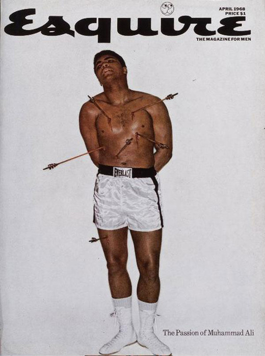 Мухаммед Али, пронзенный шестью стрелами под заголовком «Страсть Мухаммеда Али», появился на обложке Esquire после отказа Али вступить в ряды американской армии в связи с его религиозными убеждениями. В связи с чем Мухаммед впоследствии был дисквалифицирован и лишен своего звания.