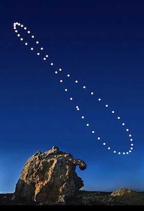 АналеммаЕсли мы возьмём фотоаппарат и каждый день ровно в полдень будем фотографировать солнце над горизонтом, а спустя год сложим все наши фотографии в одну картинку, то увидим, что солнце как бы рисует в небе необычную фигуру, похожую на вытянутую цифру 8. Эта фигура называется «аналемма», что по-гречески означает «основа».