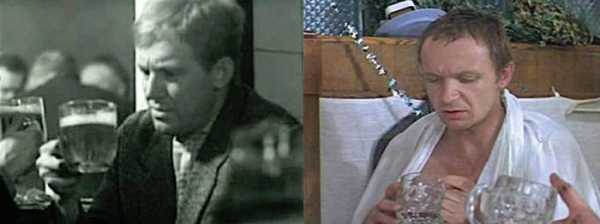 Вот, например, – двое за рулём. Похожи? Что мы знаем о том, кто слева? Упакован, «хорошо имеет от жизни», своя машина, способен подарить французские духи – по всем статьям завидный жених, а до сих пор холост. Более того, в отношениях с женщинами явно неблагополучен, – может, оттого и ревнив. Из монолога под душем («Конец Новогодней ночи, завтра наступит похмелье — пустота-а…») следует, что у Ипполита есть опыт подобных похмелий, а значит, и опыт предшествующих им романтических безумств тоже есть…