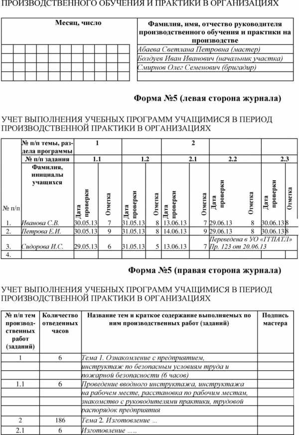 6 приказу предприятия о закреплении руководителей практики за учащимися - по форме 5 ведется учет выполнения учебных программ учащимися в период производственного обучения и практики на предприятиях, пунктах технического обслуживания, учебных хозяйствах. На правой стороне формы записываются порядковый номер тем, разделов программ производственных работ (заданий), указывается количество отводимых часов, наименование этих тем и краткое содержание выполняемых по ним производственных работ или заданий согласно утвержденному тематическому, перспективно-тематическому планам и детальной программе предвыпускной производственной практики. На левой стороне напротив фамилии учащегося мастером отмечается по этим темам (производственным работам или заданиям) дата проверки и оценка за их выполнение. При проведении проверочных работ сделать запись об их проведении. В этот период учащиеся ежедневно ведут дневники учета выполненных работ. На странице, где записывается пройденный материал, в конце итогового периода (полугодия) мастер п/о записывает число проведенных уроков «по программе» и «фактически», что заверяет подписью. В конце изучения курса после предыдущей записи делается запись: «Программа пройдена полностью» (или «не пройдены следующие темы»). По завершению курса обучения вместо проверочной работы проводится квалификационная (пробная) работа без записи в журнале п/о в форме 5. - по форме 6 отражаются итоги производственного обучения за I -е, II-е полугодия и учебный год каждого курса обучения. Записываются результаты проверочных (квалификационных) работ. Итоги поэтапной аттестации записываются с учетом реально пройденного учащимся курса обучения по одной из специальностей интегрированной профессии с присвоением соответствующей квалификации и разряда. Графа успеваемости заполняется исходя из текущей успеваемости учащихся в течение полугодия (согласно формам 2, 5). за полугодие выставляется с учетом отметки за проверочную работу. Наименование квалификации пишется напротив каждой фамилии учащегося в соответствии с образцами заполнения формы. Уровень квалификации пишется: 4(четвертый) разряд и дополнительно указывается прописью (в скобках). Графа успеваемости заполняется исходя из текущей