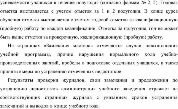 7 успеваемости учащихся в течение полугодия (согласно формам 2, 5). Годовая отметка выставляется с учетом отметок за 1 и 2 полугодия. В конце курса обучения отметка выставляется с учетом годовой отметки за квалификационную (пробную) работу по каждой квалификации. за полугодие, год не может быть выше отметки за проверочную, квалификационную (пробную) работу. На страницах «Замечания мастера» отмечаются случаи невыполнения учебной программы, прочие нарушения нормального хода учебнопроизводственных занятий, пробелы в подготовке отдельных учащихся, а также принятые меры по устранению отмеченных недостатков. Результаты проверки журналов, свои замечания и предложения по устранению недостатков администрация учебного заведения отражает на соответствующих страницах журнала с указанием сроков устранения замечаний и выводов в конце учебного года.
