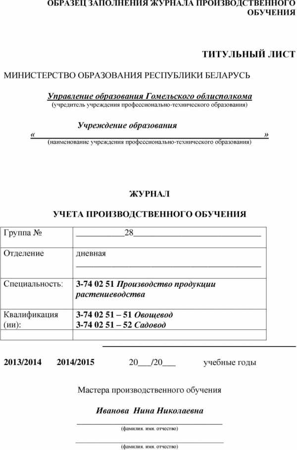 8 ОБРАЗЕЦ ЗАПОЛНЕНИЯ ЖУРНАЛА ПРОИЗВОДСТВЕННОГО ОБУЧЕНИЯ ТИТУЛЬНЫЙ ЛИСТ МИНИСТЕРСТВО ОБРАЗОВАНИЯ РЕСПУБЛИКИ БЕЛАРУСЬ Управление образования Гомельского облисполкома (учредитель учреждения профессионально-технического образования) Учреждение образования (наименование учреждения профессионально-технического образования) ЖУРНАЛ УЧЕТА ПРОИЗВОДСТВЕННОГО ОБУЧЕНИЯ Группа Отделение Специальность: Квалификация (ии): 28 дневная Производство продукции растениеводства Овощевод Садовод 2013/ / /20 учебные годы Мастера производственного обучения Иванова Нина Николаевна (фамилия. имя. отчество) (фамилия. имя. отчество)