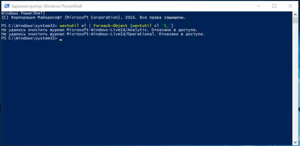 Для полной очистки журнала событий Windows 10 также можно использовать PowerShell. Запустите консоль от имени администратора и выполните в ней связку двух командлетов: