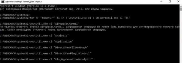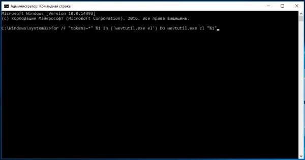 2. Введите команду for /F "tokens=*" %1 in ('wevtutil.exe el') DO wevtutil.exe cl "%1" и нажмите клавишу Enter. По завершению очистки закройте командную строку.