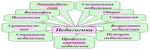 Педагогика представляет науку, изучающую сущность, закономерности, тенденции и перспективы развития педагогического процесса (образования) как фактора и средства развития человека на протяжении всей его жизни. Педагогика может быть представлена или классифицирована на несколько отраслей, которые с одной стороны объединены основными целями и выполняемыми задачами, с другой стороны каждая отрасль педагогики по-своему уникальна и специфична [1]. На рисунке 1 схематично показаны отрасли педагогики. В данную классификацию включены как отрасли педагогики такие научные дисциплины, как: философия, психология и социология, которые чуть ниже рассматриваются также в контексте связи педагогики с другими науками.