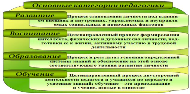 Педагогическая деятельность,как вид профессиональной деятельности, базируется на основных категориях. Таким образом, педагогические категории представляют собой систему понятий, характеризующих педагогическую науку. На рисунке 2 представлены основные педагогические категории.