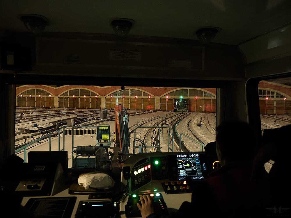 Мой друг и коллега Александр. Сейчас в депо метрополитена некоторых линейных машинистов (а он линейный машинист) обучают работе на моторельсовом транспорте, чтобы знали и умели, и в случае чего могли заменить машиниста, вот Александр сейчас как раз находится на стажировке. Приёмка состава. Соединение воздушной магистрали тут немного другое, чем на пассажирских составах.