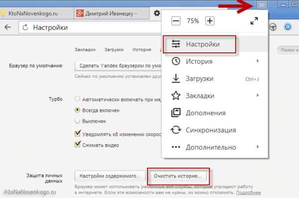Для вызова окна очистки истории можно воспользоваться комбинацией клавиш Ctrl+Shift+Delete, находясь в окне браузера, либо перейти из меню кнопки с тремя горизонтальными полосками в настройке браузера и найти там кнопку «Очистить историю».