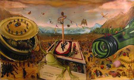 Соединение живописи с юмором — один из сложнейших фокусов в изобразительном искусстве. Большая картина кажется избыточной, когда речь идет о карикатуре, чье место скорее в газете. Есть риск зря растратить «серьезные» художественные средства, есть и риск эти средства девальвировать, сделать дешевку: все равно ведь будут смотреть на сюжет, а не на технику. Николай Копейкин, много и успешно выставляющийся художник, доказывает, что все эти сложности преодолимы.