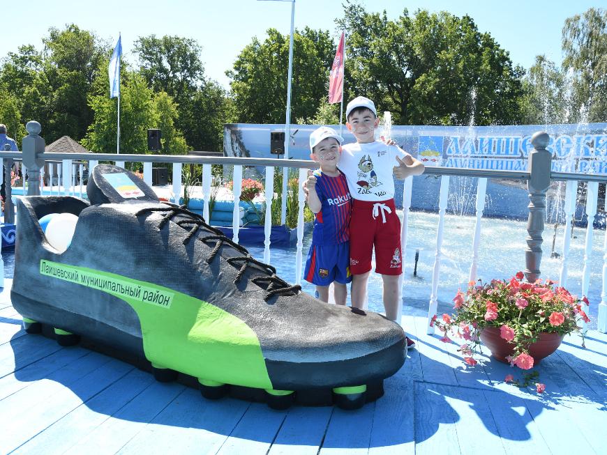 Конечно, в развлечениях, которые подготовили гостям в районах Татарстана в этом году, отразилась и футбольная тематика. Например, на площадке Лаишевского района, куда гости вошли через красочные голубые украшенные резьбой ворота, на миниатюрном футбольном поле участникам Сабантуя предлагали забить мячи в маленькие ворота. Первым на поле вышел Мэр Казани, который отправил все три мяча в ворота. Свое мастерство проверили также митрополит Феофан, Камиль хазрат и Шамиль Тарпищев. Рядом с футбольной площадкой выступала группа девочек, занимающихся чирлидингом. Своими футбольными полями на нынешнем Сабантуе обзавелись и другие подворья. Кроме того, гостей ждало немало футбольных фотозон, где можно было сфотографироваться, например, с талисманом чемпионата мира по футболу волком Забивакой. Одним из запоминающихся объектов оформления стали гигантские бутсы с гербом Лаишевского района.