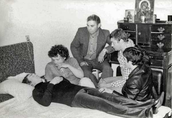 Панихида в холле подъезда утром 28 июля 1980 года.Слева направо: отец и мачеха Владимира, Оксана Афанасьева (Ярмольник), над изголовьем (высокий) - сын Марины Влади Пьер, администратор В. Янклович, Н.Высоцкий, М.Влади, мать Владимира, И. Годяев и В. Шехтман (двоюродный брат В. Абдулова)