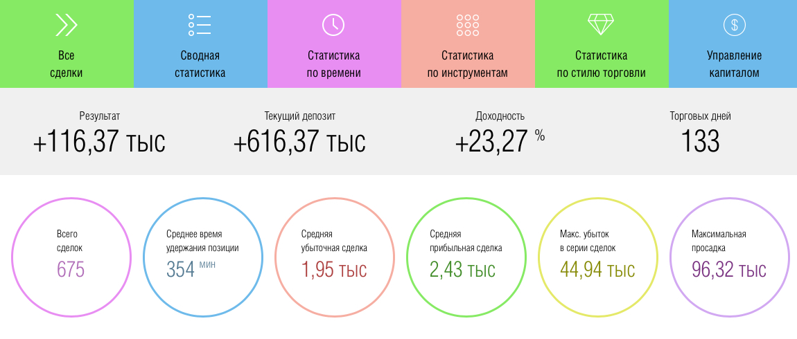 Для составления полной и грамотной аналитики в распоряжении трейдера 77 графиков и диаграмм, 37 цифровых показателей, 21 сводная таблица, благодаря которым торговля проходит тщательный беспристрастный анализ. В итоге за несколько секунд получается отчет, выполненный в автоматическом режиме.