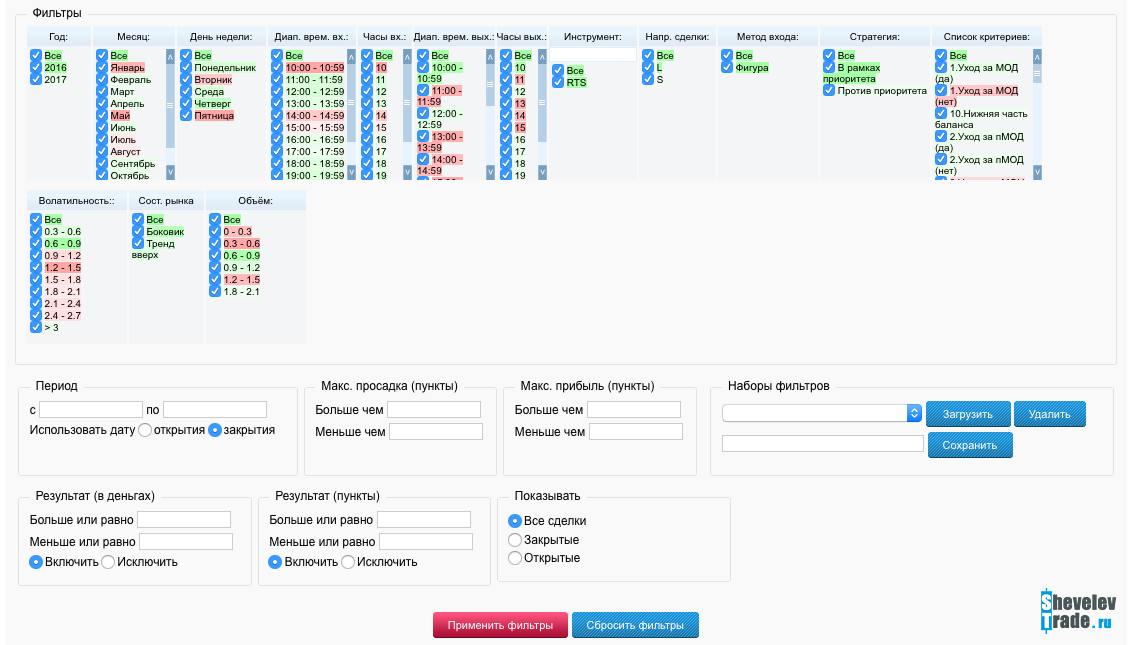Для каждой группы аналитики реализованы интеллектуальные фильтры. Используя эти фильтры, можно детально рассмотреть каждый негативный или позитивный разрез торговли, при этом как в отдельности, так и в совокупности с другими. Т.е. можно исключать любой разрез и наглядно видеть, как при этом меняется итоговый результат.