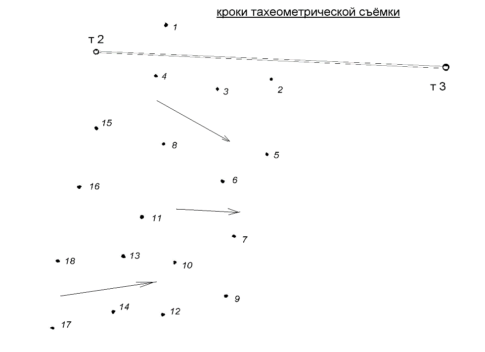 Быстрота съёмки имеет и свой недостаток. Рельеф как сложный объект съёмки должен быть в полевых условиях (в течение короткого времени) правильно осознан и адекватно отображен в полевых записях. Основной полевой документ тахеометрической съёмки – кроки (рис. 5.2), иногда по аналогии с теодолитной съёмкой его называют абрис. Это эскиз горизонтальной проекции снимаемого участка, на котором показаны пункты съёмочного обоснования, тахеометрическая станция, элементы ситуации, реечные точки, направления скатов местности, характерные точки и структурные линии рельефа. Вторым важным документом будет журнал тахеометрической съёмки (табл. 5.1). Заполнение журнала следует вести по стандартной форме, четко, без исправления записей и, как правило, карандашом. Для удобства ведения записи журнал и кроки должны иметь жесткую обложку.