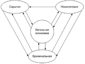 Схема финансовых потоков между легальной экономикой и тремя сферами теневой экономики, а также между этими сферами представлена на рисунке 1.