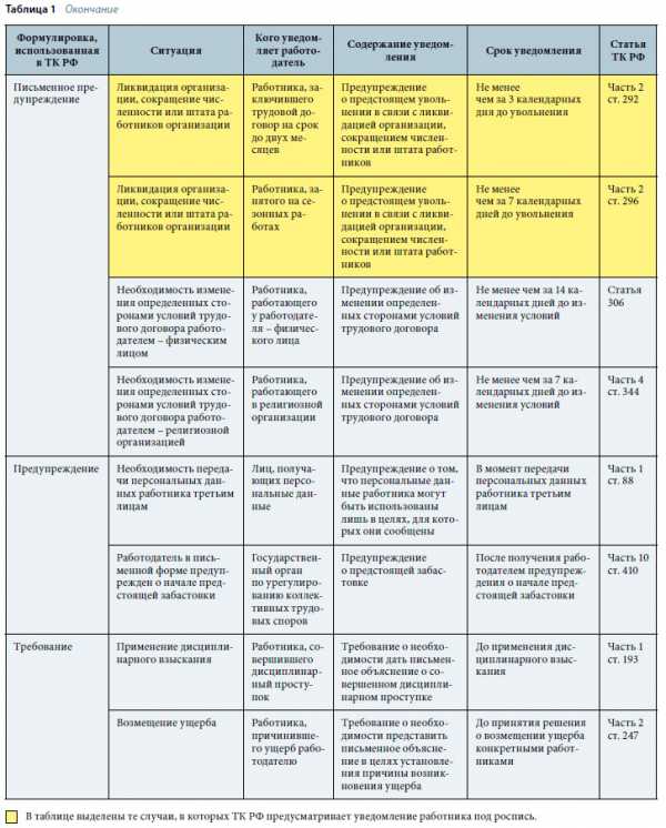 Обратите внимание: отдельные нормы Кодекса прямо предписывают уведомлять работника о чем-либо «под роспись». Очевидно, что в этих случаях, а также когда ТК РФ предусматривает «письменное уведомление», «письменное сообщение», «письменное извещение» и «письменное предупреждение», оформление соответствующего документа обязательно. В остальных случаях ссылки на письменную форму уведомлений нет, но на практике работники кадровой службы предпочитают информировать работников или других лиц письменно, чтобы у работодателя имелось документальное подтверждение выполнения его обязанностей.