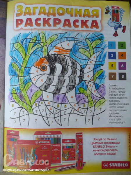 Очень порадовало отсутствие в журнале рекламы! Очень-очень порадовало. В современных детских журналах рекламы больше, чем самого содержания - замучаешься объяснять, почему невозможно всех этих Винкс, киндеры, гавкающих собачек и прочих жителей "Детского мира" прикупить в личное владение и пользование. В "Веселых картинках" ничего подобного нет. Единственная страничка с рекламой, которую редакторы допускают - это реклама карандашей. Да и она дается не в качестве рекламы как таковой, а в виде интересного задания. Да и карандаши - это не тот товар, который раззорит родителей, и не тот товар, который будет лишним, в отличие от стописятой куклы фирмы Братс.
