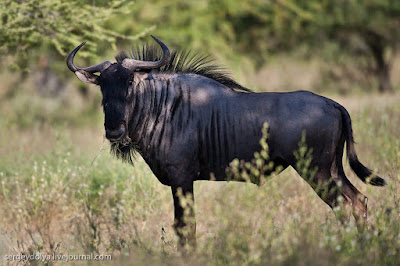 Внешний вид антилопы гну настолько своеобразен, что ее трудно перепутать с другим животным - плотное и короткое тело на непропорционально тонких ногах, тяжелая, украшенная острыми рогами и гривой голова, пушистый хвост. Рядом с ними обязательно находятся небольшие табунки симпатичных африканских лошадок - зебр.