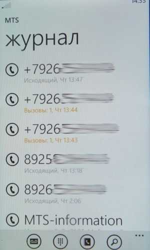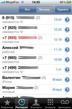 Первая из пяти закладок — Журнал звонков. Вполне привычный по устройству: три списка: пропущенные, принятые, набранные.