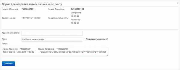 В ней необходимо указать электронную почту, на которую необходимо отправить запись, а так же при желании скорректировать тему и текст письма. Если галочка с опции "Прикрепить запись" снята, будет отправлена только информация по звонку (дата и время звонка, номер с которого звонили, номер на который звонили), без самой записи разговора. | |