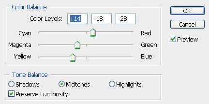 Добавляем корректирующий слой Layer - New Adjustment Layer - Color Balance (Слой - Новый корректирующий слой - Цветовой баланс).