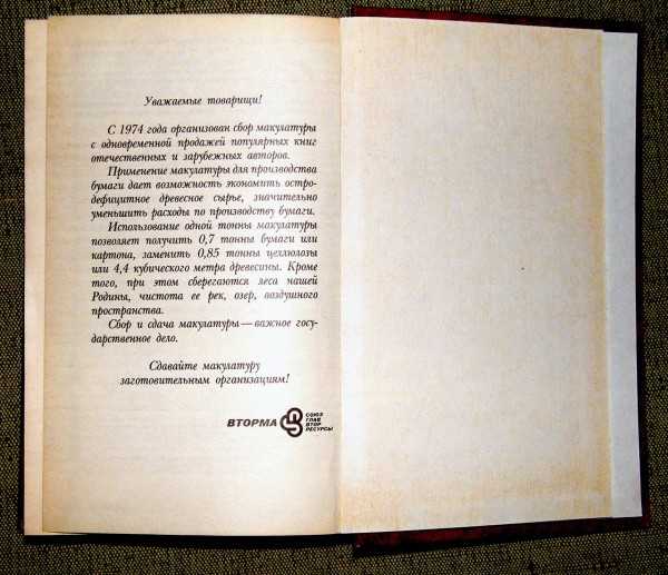 Объявление, напечатанное в конце книге, призывает сдавать макулатуру заготовительным организациям