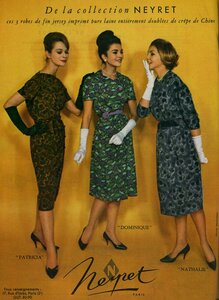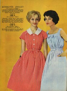 61- год.Широкие юбки еще встречаются, но не так часто, как в 60-м и те более в 50-х. Преобладают узкие юбки и достаточно короткий и широкий верх, меньше применяются пояса.