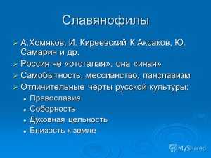 Славянофилы опирались на «самобытников», на православно-русское направление в общественной мысли России. В основе их философского учения лежала идея о мессианской роли русского народа, о его религиозной и культурной самобытности и даже исключительности. Исходный тезис учения славянофилов состоит в утверждении решающей роли православия для развития всей мировой цивилизации. По мнению А.С. Хомякова, именно православие сформировало «те исконно русские начала, тот «русский дух», который создал русскую землю в ее бесконечном объеме»