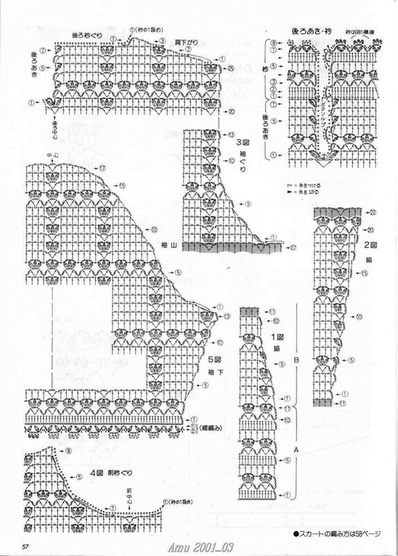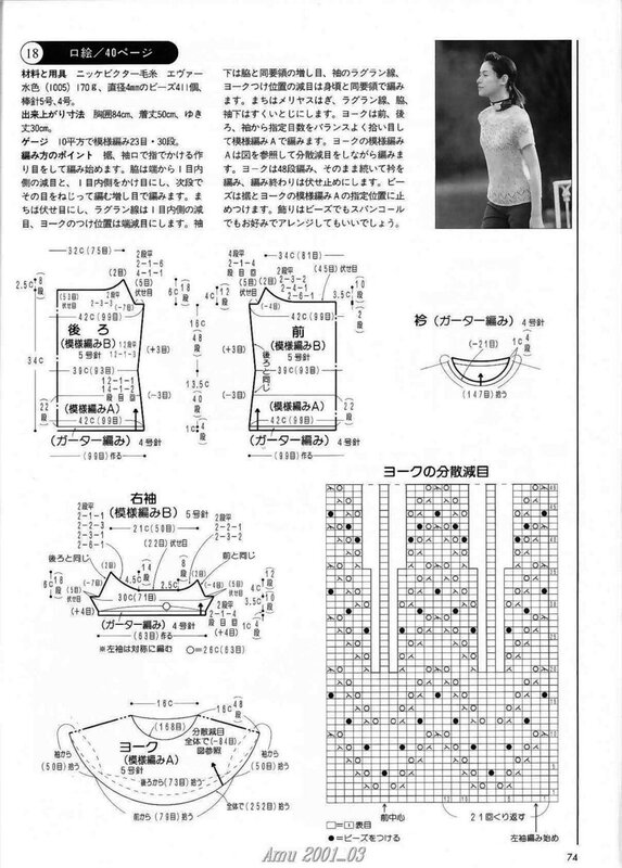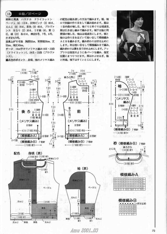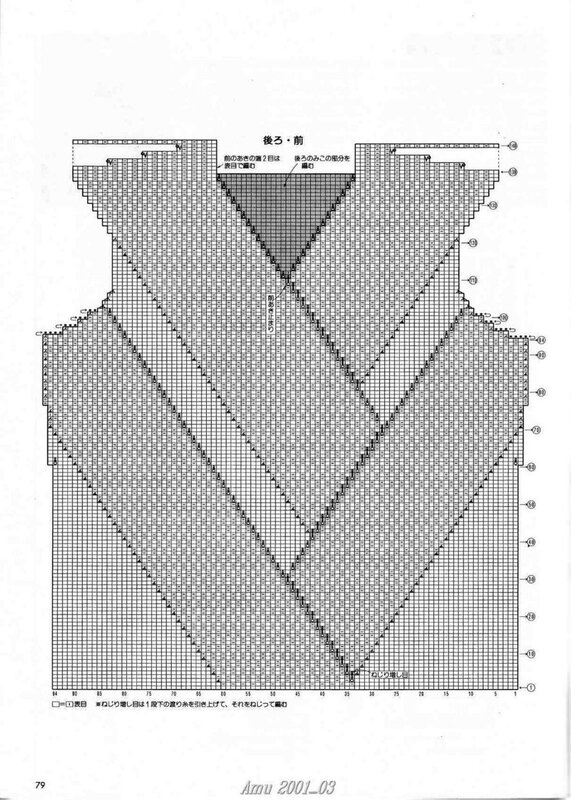 означает петля) и первые 18 рядов вяжем по схеме А.Теперь мы дошли до убавления петель для проймы переда и спинки и для горловины.Начнем с пройм. Все убавления в японских журналах идут по следующей схеме. Через каждые «Х» рядов (